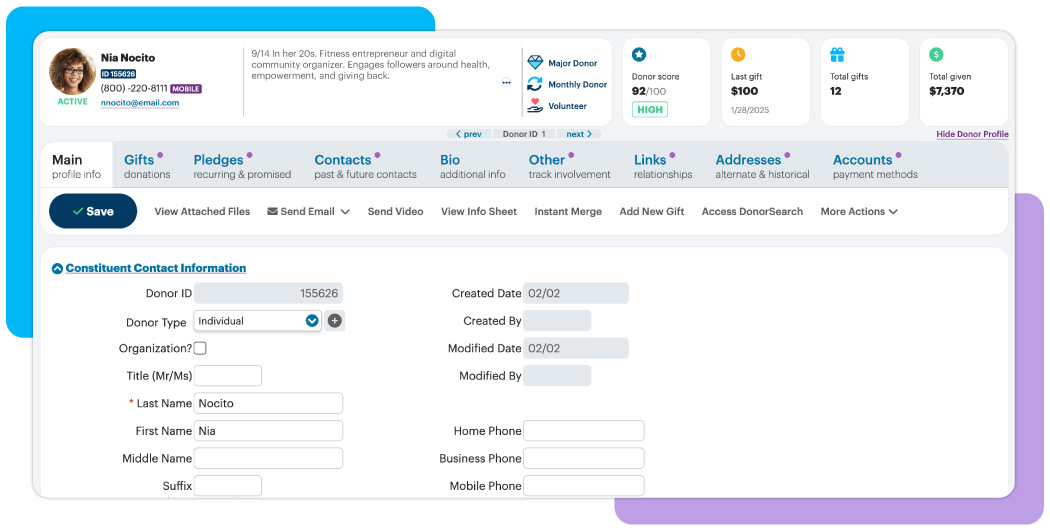 Donor profiles give you and your staff familiarity with your loyal supporters, helping to create essential bonds that foster retention.